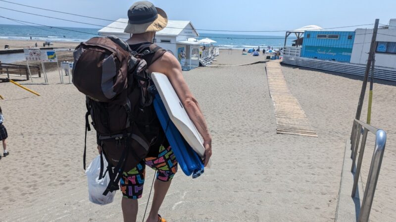 テントとビーチチェアとボディボードと昼食を持って…